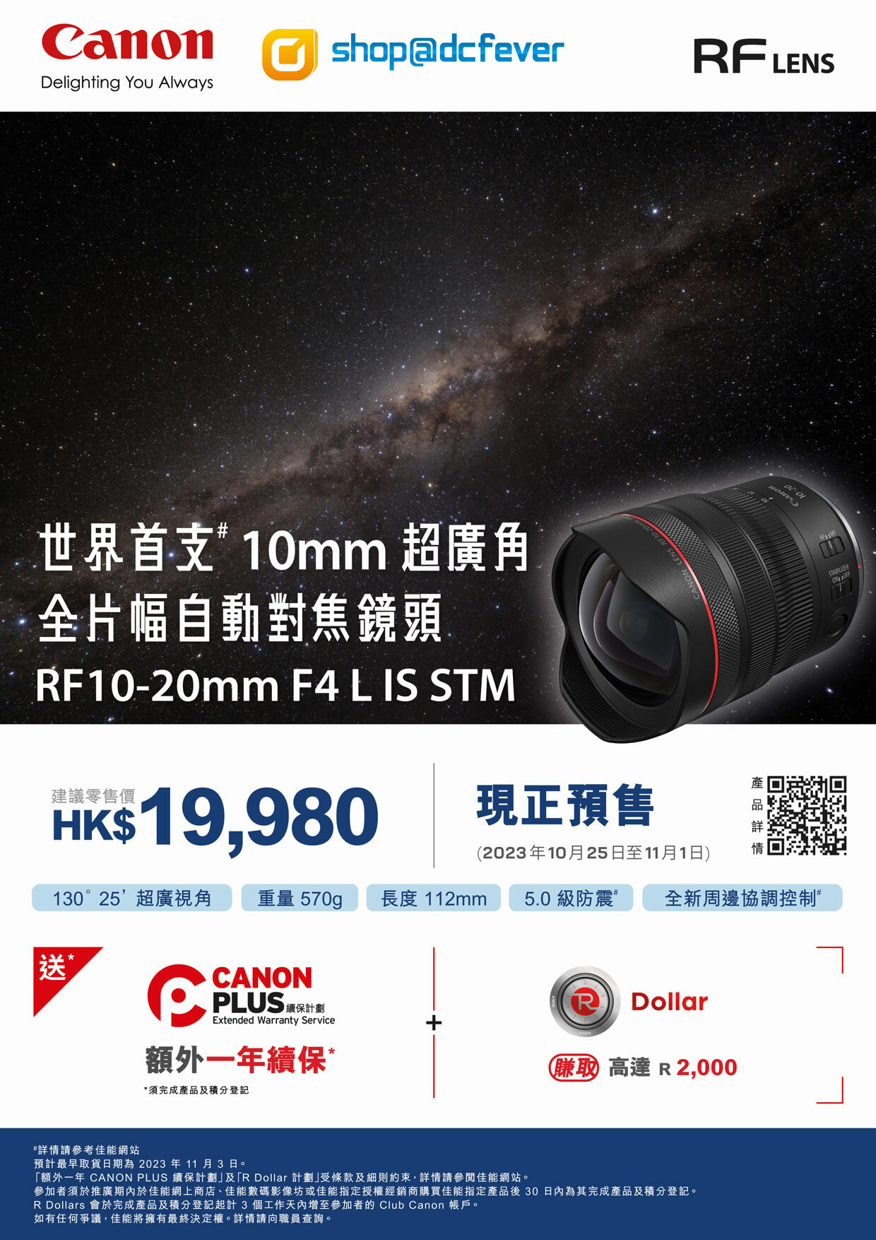 RF10-20mm F4 L IS STM是世界首支10mm 超廣角全片幅自動對焦鏡頭1,提供10mm-20mm超廣角變焦範圍之餘亦保持鏡頭設計輕巧,其長度僅約112毫米及重量只有約570克。鏡頭內置的光學影像穩定器,除了提供5級防震效果2外,更首次加入「周邊協調控制 (Peripheral Coordinated Control)」4 ,配合機身防震時能有效校正廣角鏡頭經常出現的周邊震動模糊,令相片的周邊都有更高的影像質素,拍攝短片時亦可以減低畫面周邊的輕微震動5。
